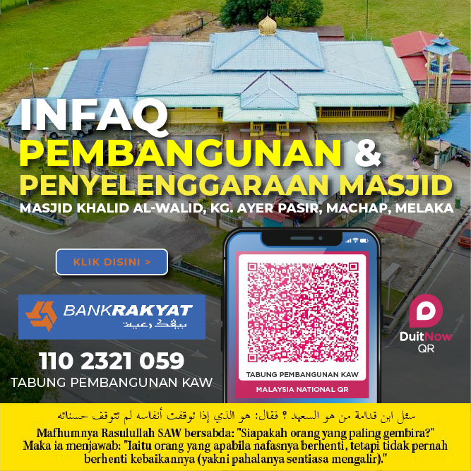Sumbangan ini bertujuan bagi menampung kos operasi Masjid Khalid Al-Walid, Kg. Ayer Pasir, Machap, Alor Gajah, Melaka seperti utiliti (elektrik/air/unifi), penyelenggaraan dan operasi, pembangunan, majlis ilmu online, aktiviti dan program pengimarahan di Masjid Khalid Al-Walid, Kg. Ayer Pasir, Machap, Alor Gajah, Melaka.